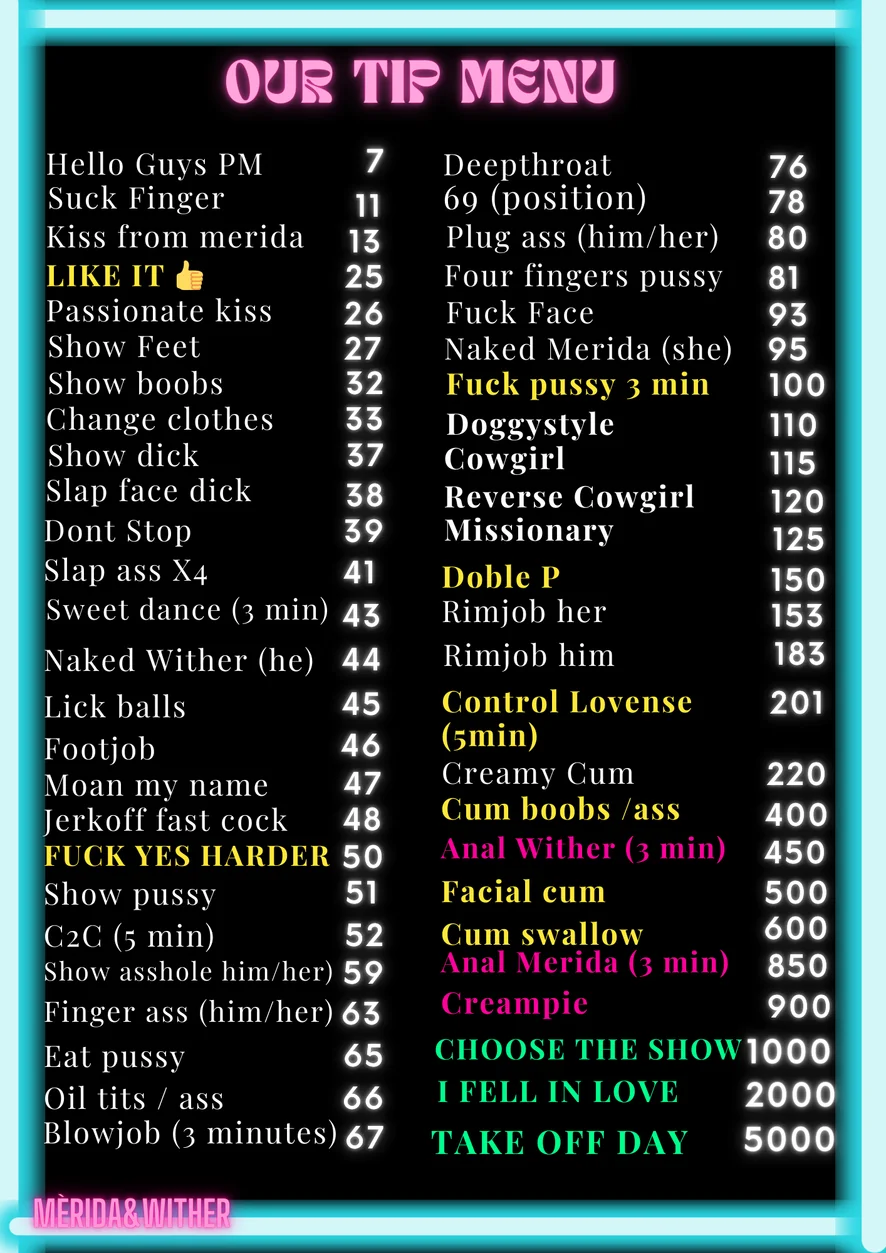Pecorina, Ballo erotico, Zoccolo di cammello, Ditalino, Dildo o Vibratore, Linguaggio esplicito, Spogliarello, Esibizionismo, Leccata di figa, Pompino, Cucina, Masturbazione, Ripresa della gonna da sotto, Tittyfuck, Topless, Sborrata, Giocattoli anali, Donna sopra, Tacchi, Hardcore, Sculacciate, Feticismo dei piedi, Spettacolo con olio, Posizione 69, Fisting, Massaggio, Tradimento, Istruzioni per sborrare, Seghe con i piedi, Valutazione del cazzo, Creampie, Sborrata in faccia, Giocattoli erotici, Orgasmo, Nylon, Gagging, Doccia, Giochi di ruolo, Anale, Umiliazione, Mistress, Facesitting